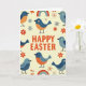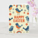 Concebido com um fundo marfim cremoso, este cartão temático da Páscoa apresenta uma saudação festiva em letras laranjas grandes bem no centro. Ao redor do texto, vários pássaros estilizados se reúnem como se estivessem se fazendo companhia, suas cabeças e asas sombreado em tons de azul escuro e claro. Seus corpos arredondados são pontilhados com manchas quentes laranjas e azuis suaves, e algumas pequenas formas de coração estão em suas bochechas para sugerir um vínculo doce e amigável. Espalhadas entre eles estão formas simples de flores em tons de vermelho e laranja suaves, adicionando um toque suave de primavera 🌷. Arcos de arco-íris curvados flutuam nos espaços abertos, emoldurando levemente os pássaros e guiando o olhar de volta para a mensagem central. A aparência geral permanece plana e organizada, com formas suaves e uma mistura equilibrada de azuis, laranjas e verm