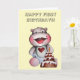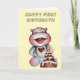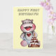 Um bebê hippo fofo e muito feliz com um bolo, celebrando seu primeiro aniversário! Personalize-o com o seu próprio texto para um cartão muito especial.
