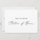 Esta delicada carta de pedido de caligrafia de honra é perfeita para um casamento moderno. A design romântica minimalista apresenta uma magnífica e elegante tipografia negra num fundo branco com um aspecto simples e limpo. Personalize o cartão com o nome da noiva e a matriz de honra. Personalize a parte traseira do cartão com uma mensagem personalizada.