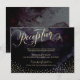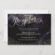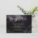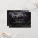 Design de caligrafia com letra à mão em ouro glamoroso e confetes de pontos dourados em fundo preto escuro de aquarela noturna, efeito brilhante de brilho metálico dourado falso, moderno, chique, limpo e elegante, perfeito para casamento vintage ou casamento de inverno à noite. Personalize seu próprio cartão de recepção para o conjunto de convite de casamento.