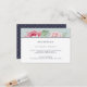 Projetado para coordenar com o nosso casamento Antiquado Peony e os convites para eventos em Blush and Sage, este cartão de recepção de safra moderno apresenta flores cor-de-água cor-de-rosa pincelada atrás de um painel frontal em branco e azul-da-noite, sobre um fundo verde pastel mudo. Adicione seus detalhes de recepção, incluindo horário, local e quaisquer informações adicionais como estacionamento de manobrista ou serviço de vaivém.