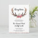 Cartão de cerimônia de núpcias com galhadas de veados e flores. Perfeito para casamentos de celeiro de verão e festas boêmicas.