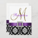 A elegância sofisticada é transmitida por este lindo design de convite de recepção de casamento. Um padrão floral damasco preto e branco serve de fundo para um efeito de foto da inicial "M" em dourado metálico e uma fita de cetim roxa e broche de diamante, TUDO IMPRESSO em um CARTÃO PLANO. Uma maneira perfeita de convidar seus convidados para a recepção do seu casamento. Padrão damasco contemporâneo, porém clássico, com um design que permite personalizar a frente com seus nomes ou a palavra "recepção" e o verso está livre para adicionar o texto personalizado do convite de recepção de casamento. O convite de recepção de casamento está configurado para a inicial do monograma "M". Para outras letras ou cores de fita ou damasco, por favor, entre em contato com o designer em luxuryweddinginvitations@gmail.com. Design de layout por Elke Clarke©. Gráficos licenciados.