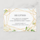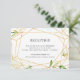 Projetado para combinar com nossa coleção de casamento Terrarium, este cartão de recinto de recepção elegante apresenta uma borda geométrica dourada acentuada com ramalhetes de folhas e folhagens de aquarela verde. Personalize com os detalhes da sua recepção, horário, local e endereço.