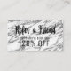 Esse padrão de mármore preto e branco moderno e simples, consulte que um cartão de referência de desconto de amigo é perfeito para o proprietário da empresa de tendências e na moda. Esse cartão de aparência elegante e profissional é a forma perfeita de mostrar aos seus clientes que você se importa com seus negócios. Personalize este cartão para qualquer empresa, basta editar o texto e adicionar seus próprios detalhes pessoais.