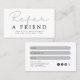 Aumente a sua empresa com um cartão de desconto de referência-um-amigo! Recompense seus clientes leais e atraia novos clientes com nosso modelo de cartão de desconto de referência a amigo. Encoraje seus clientes a espalhar a palavra sobre sua empresa e a assistir ao crescimento de suas vendas. Aqui está o que nosso modelo inclui: design completamente personalizável: Personalize a placa com o logotipo da sua marca, cores e mensagens para torná-la realmente sua. Instruções simples: explique claramente como a placa funciona para que seus clientes possam entender e começar a consultar seus amigos com facilidade. Opções flexíveis de desconto: Escolha a quantia ou porcentagem de desconto que funciona melhor para sua empresa e seus clientes. Usando nosso cartão de desconto de referência-um-amigo, você pode: ⟶ Aumentar a fidelidade do cliente: seus clientes apreciarão a oportunidade de economizar dinheiro e serão recompensados por suas remessas. ⟶ Adquira novos clientes: seus clientes atuais provavelmente encaminharão seus amigos e familiares, o que pode ajudá-lo a alcançar novos públicos e aumentar sua base de clientes. ⟶ Aumente as vendas: quanto mais consultas você receber, mais vendas você fará e mais sucesso sua empresa será. Obtenha seu modelo de cartão de desconto de referência-um-amigo hoje e comece a impulsionar sua empresa!