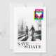 Um cartão de foto de reserva de data com design moderno e uma explosão de cor brilhante em estilo de impressão CMYK.