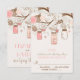 Cartão de resposta personalizável com ilustração caprichosa em rosa e marrom de jarras mason, flores, pombinhos e gaiolas. É perfeito para eventos temáticos shabby chic e vintage.