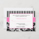 Este cartão de RSVP moderno com listras rosa, preto e branco com damasco floral combina com o convite de casamento mostrado abaixo. O texto e o tipo de papel são personalizáveis. ****POR FAVOR, certifique-se de que todo o texto esteja centralizado e dimensionado exatamente onde você deseja, pois será impresso exatamente da maneira como você o vê no seu monitor. Eu não vou ver, e a Zazzle não editará nada, então se você precisar de ajuda, por favor me envie um e-mail ANTES de fazer o seu pedido. Se você precisar de itens correspondentes, por favor envie seu pedido para niteowlstudio@gmail.com.