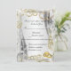 Lindo com redemoinhos dourados, detalhes de diamantes e alianças de casamento douradas. Este lindo cartão de RSVP/resposta de casamento está pronto para ser personalizado para o seu dia especial de casamento. Personalize o cartão alterando o texto nos campos fornecidos na frente e no verso. Você pode alterar o estilo da fonte, tamanho e cor, bem como o tipo e estilo de papel.