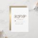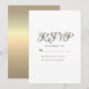 Cartão de resposta de casamento simples, mínimo, com tipografia, branco puro, com verso dourado ombre metálico moderno e brilhante.