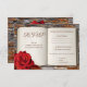 Um cartão de resposta de casamento romântico com um livro e uma rosa vermelha sobre um fundo de parede de tijolos. Este cartão de resposta faz parte de uma coleção de casamento com um tema de biblioteca ou amantes de livros.