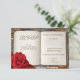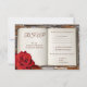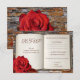 Um cartão de resposta de casamento romântico com um livro e uma rosa vermelha em um fundo de parede de tijolos. Este cartão de resposta faz parte de uma coleção de casamento com um tema de biblioteca ou amantes de livros.