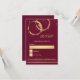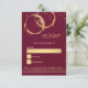 Cartão de resposta elegante com manchas de vinho em tons de dourado e rose gold intersectando, com confetes em um fundo burgundy. A frente tem uma imagem de fundo de texto separada para facilitar a escrita dos seus convidados. Você pode arrastar ou excluir essa imagem de acordo com as suas necessidades.
