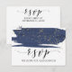Este cartão de confirmação de presença para música em aquarela azul-marinho e dourado é perfeito para um casamento elegante. Este design abstrato de noite estrelada apresenta um pincel dramático de aquarela azul-marinho sobreposto com belo brilho dourado falso. Construa sua lista de convidados e a lista de músicas para a pista de dança de uma só vez! Este cartão de resposta de casamento convenientemente pergunta aos convidados se eles poderão comparecer ao seu casamento e também qual música os fará dançar.