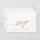Este cartão de confirmação de presença e pedido de música com caligrafia em dourado é perfeito para um casamento simples. O design neutro apresenta um cartão minimalista decorado com tipografia romântica e caprichosa em folha de ouro falsa. Construa sua lista de convidados e a lista de músicas para a pista de dança de uma só vez! Este cartão de resposta de casamento convenientemente pergunta aos convidados se eles poderão comparecer ao seu casamento e também qual música os fará dançar.