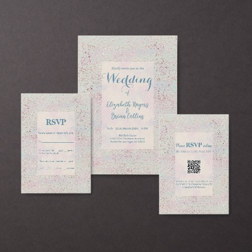 Cartão único e elegante RSVP sofisticado, personalizado, para casamento com sotaques texturais em cobre em fundo azul e rosa com texto azul. Um design de cartas delicado e gentil. Design inclui o número de convidados e a escolha das refeições na cerimônia de casamento.