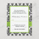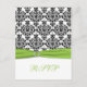 Este cartão de RSVP em damasco preto e branco com uma fita impressa em verde lima e broche de joia combina com o convite de casamento mostrado abaixo. Se você precisar de outros itens correspondentes ou quiser em outra combinação de cores, envie um e-mail para niteowlstudio@gmail.com com sua solicitação.