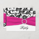 Este cartão de resposta floral em damasco preto e branco tem uma fita impressa rosa quente com um broche de cristais que combina com o convite de casamento mostrado abaixo. Se você precisar de outros itens correspondentes ou gostaria de ter em outra combinação de cores, envie um e-mail para niteowlstudio@gmail.com com sua solicitação.