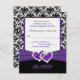 Este cartão de RSVP em damasco preto e branco tem uma fita roxa impressa e corações de diamantes unidos com brilho impresso que combina com o convite de casamento mostrado abaixo. Se você precisar de outros itens correspondentes ou gostaria de ter em outra combinação de cores, envie um e-mail para niteowlstudio@gmail.com com sua solicitação.