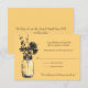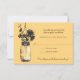 Perfeito para um casamento country ou talvez você simplesmente adore potes de Mason! Antigo pote de Mason vintage pendurado em um gancho com flores silvestres country. Uma cor de fundo amarelo maravilhosa com desenho preto de um pote de Mason cheio de flores silvestres country. Se tiver alguma dúvida sobre este design ou quiser uma mudança de cor, por favor me envie um email paula@labellarue.com. Verifique também os cartões de CONVITE DE CASAMENTO PRINCIPAL, RECEÇÃO e ASSENTOS DOS CONVIDADOS para combinar! Este cartão de RSVP de 3,5x5 está configurado como um cartão postal. Basta adicionar o seu endereço de retorno no verso.