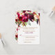 Este lindo cartão de resposta de casamento com flores e penas em aquarela na cor burgundy apresenta rosas ou flores do tipo peônia nas cores burgundy, carmesim, berinjela, marsala e creme com folhas verdes e ramos nas tonalidades verde-oliva, ferrugem, laranja queimada e marrom, juntamente com penas coloridas variadas em laranja, roxo, cinza e preto. A redação personalizável está numa paleta de cores dourado e burgundy e o verso tem um padrão geral de buquês nas mesmas cores.
