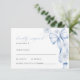 Um cartão de RSVP elegante inspirado no inverno, projetado para uma celebração de chá de noiva. Este cartão de resposta refinado apresenta um laço azul suave empoeirado com detalhes florais delicados, criando um visual romântico e atemporal. Perfeito para combinar com papelaria de chá de noiva temática de inverno, este design combina elegância clássica com um fundo branco limpo, tornando-o ideal para celebrações formais e sazonais. Totalmente personalizável com nomes de convidados e detalhes de presença.