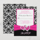 Este cartão RSVP damasco preto e branco tem uma fita impressa rosa choque e uma broche de diamantes unidos em coração impresso e brilhante que combina com o convite de casamento mostrado abaixo. Se você precisar de outros itens correspondentes ou gostaria de ter em outra combinação de cores, envie um e-mail para niteowlstudio@gmail.com com sua solicitação.