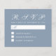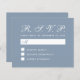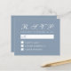 Um cartão de resposta de orçamento simples e minimalista para um casamento. Tem apenas texto branco em um fundo azul empoeirado. O título RSVP e a letra M são escritos em uma letra cursiva elegante, o resto em maiúsculas.