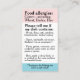 Fazer jantar mais seguro com este cartão de restaurante de alergia a glúten. Projetada em tamanho de cartão de visita, esta ferramenta prática comunica claramente as necessidades dietéticas aos chefs e ao funcionarios da cozinha. Possuindo espaço para escrever o número da mesa e a entrada, pode ser colocada com uma refeição como está preparada, garantindo segurança adicional para aqueles com doença celíaca ou intolerância ao glúten. Fácil de carregar em uma carteira ou bolsa, este cartão ajuda a reduzir o estresse em restaurantes, cafeterias escolares e eventos. É preciso ter para quem vive sem glúten ou que gerencia alergias comidas.