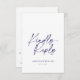 Este cartão de resposta branco elegante apresenta um design de caligrafia sofisticado e moderno com "Kindly Reply" em letra azul marinho estilosa. Personalizado com os nomes do casal e a data do casamento, este cartão de resposta de convite refinado é perfeito para temas de casamento formais e atemporais. Uma ótima maneira de coletar respostas dos convidados, adicionando um toque de elegância à papelaria do seu casamento.