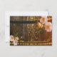 Cartões de RSVP temáticos de vinho romântico com uvas e rosas cor-de-rosa em um fundo de barril de vinho com luzes festivas. Este cartão de RSVP apresenta um modelo de código QR fácil de personalizar. Parte de uma coleção de casamento e também pode ser usado para outras celebrações temáticas de vinho.