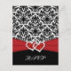 Este cartão de RSVP de casamento em damasco preto e branco, elegante e romântico, possui uma fita vermelha impressa e um par de corações unidos com jóia de diamante impressa e brilho falso vermelho, que combina com o convite de casamento mostrado abaixo. Perfeito para celebração de casamento romântico na primavera, verão, outono, inverno ou no Dia dos Namorados. A escolha do papel é personalizável. Se precisar de outros itens correspondentes, envie um email para niteowlstudio@gmail.com.