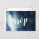 Cartão de RSVP elegante para o seu casamento com tema azul marinho e dourado! Este cartão tem um fundo de aquarela pintado à mão em cor ombre azul marinho. Diz "rsvp" em fonte de letra moderna. No verso, há brilhos dourados em ambos os lados do cartão, e os convidados podem escrever seu nome, número de acompanhantes e sua escolha de refeição para o jantar. Os textos são facilmente personalizáveis online.