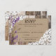 Design de cartão de RSVP de casamento country western rústico com flores de lavanda e renda branca sobre fundo de linho e tábuas de madeira envelhecida.