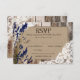 Desenho de cartão de RSVP de casamento country western rústico com flores de lavanda azul-marinho e renda branca sobre fundo com textura de linho e tábuas de madeira de celeiro.