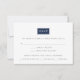 Elegantes, sofisticados e modernos, esses cartões de resposta de casamento ultra modernos apresentam "RSVP" definido em um elemento retangular que pode ser personalizado com o clique de um botão para combinar com as cores do seu casamento. Adicione a data de RSVP desejada, aceitação e declínio, e preferências de refeição ou entrada em letras sans serif modernas em cinza carvão, e ajuste a cor de acordo com sua preferência usando as instruções fáceis abaixo. Os cartões têm o verso com um padrão opcional de chave grega moderna. Mostrado em azul clássico e branco.