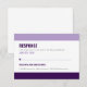 Estes cartões de RSVP de convite de casamento ousados e coloridos se destacam com grandes toques de cor e uma fonte moderna sem serifa. Mostrado em roxo, mas pode ser ajustado para combinar com o tema de cor do seu casamento! Combina com nosso convite Ousado e Colorido.