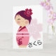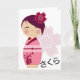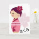 Boneca de Kokeshi que veste um quimono cor-de-rosa com detalhes da flor de cerejeira. A flor de cerejeira é um presságio da boa fortuna e é igualmente um emblema do amor, afeição e representa o primavera.