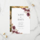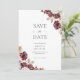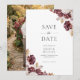 Anuncie seu casamento próximo com este cartão de salvamento de data com hortênsia borgonha. Ele apresenta bordas clássicas nos cantos com florais de ameixa sombria e creme em aquarela sobre um fundo branco crocante. Personalize com sua foto no verso. Este design é perfeito para casais que planejam uma cerimônia de jardim romântica de outono com um tema botânico elegante ou uma celebração sofisticada de vinhedo.