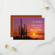 Este cartão moderno apresenta uma bela paisagem desértica ao pôr do sol. A paleta de cores é quente e convidativa. A hora do pôr do sol adiciona um visual romântico. Este cartão é perfeito para um casamento a ser celebrado no Arizona ou em locais próximos. Também é ideal para noivos naturais desta região.