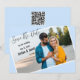 Design casual com a aparência e sensação de uma fotografia com uma borda branca. No verso do cartão há um código QR (que você pode criar) para mais informações sobre os eventos do casamento.