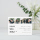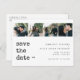 Cartão postal de salvar a data de casamento com tipografia de máquina de escrever minimalista e elegante em preto e branco com grade de colagem de 4 fotos. +++++++++++ Adequado para qualquer estação e tema. ++++++++++ Fácil de personalizar com suas fotos e detalhes!