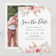 Cartão de salvar a data de casamento com flores rústicas rosadas, apresentando um lindo arranjo floral de aquarela com grama de pampas. Este cartão de salvar a data de casamento também apresenta a foto do casal no verso do cartão, dentro de uma moldura branca. Este design é ideal para casais que procuram um salvar a data romântico e antigo com um toque moderno.