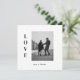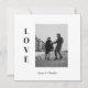Cartão plano de salvar a data de fotografia de AMOR minimalista moderno. A frente tem AMOR vertical em texto de bloco à esquerda da foto e campo de nome para noiva e noivo abaixo da foto. A parte de trás tem detalhes simples e clássicos de Salvar a Data em texto clássico moderno e script.