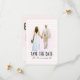 Um design simples e moderno de salvar a data. O lado da frente tem a ilustração de uma noiva e um noivo andando de mãos dadas junto com o anúncio de "salvar a data". O lado de trás do design segue o tema de cores rosa, marrom e branco. Tem o nome da noiva e do noivo em letras grandes e negrito no topo. E na parte inferior, seguem a data e os detalhes do local.