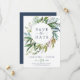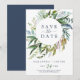 Este cartão de salvar a data de verão com folhagem é perfeito para um casamento elegante de verão. O design botânico apresenta um arranjo exuberante de eucalipto pintado à aguarela, folhagem e folhas verdes com raminhos sutis de flores cor-de-rosa desbotado.
