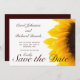 Cartão de Salvar a Data Floral com Foto de Girassol. Deslumbrante foto de girassol amarelo e marrom em um fundo branco com texto marrom em várias fontes. Uma maneira perfeita de anunciar seu casamento no campo.
