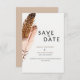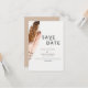 Um simples cartão de salvar data com ilustração de pena, compatível para casamentos ao ar livre (jardim) e festas de noivado modernas e internas.