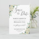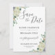 Este cartão de salvar data de casamento elegante apresenta uma bela disposição floral branca e folhagem verde. Projetado para combinar com nossa coleção de casamento Dunwich. Personalize-o com seus detalhes de forma fácil e rápida, basta pressionar o botão personalizar para reorganizar e formatar o estilo e a colocação do texto. (c) The Happy Cat Studio